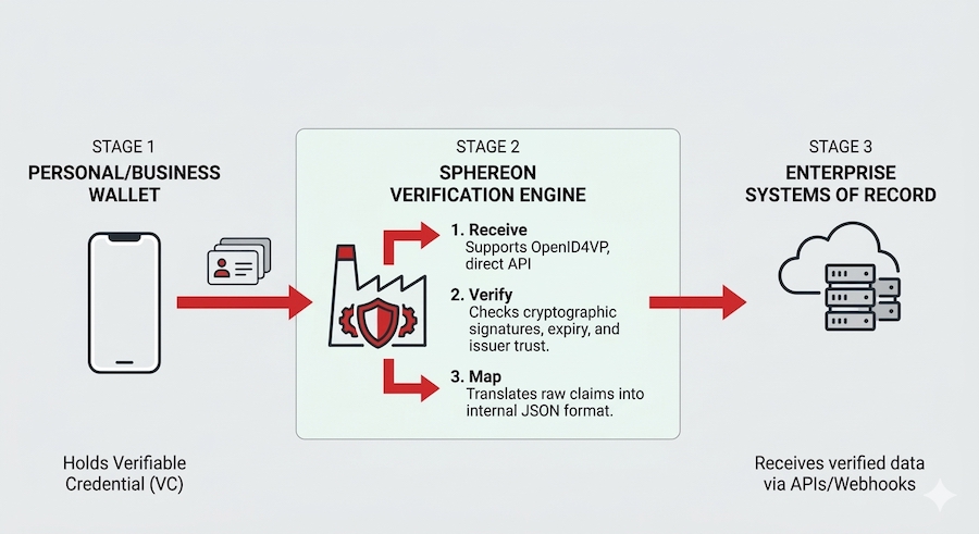 Bridge the gap between external digital wallets and your internal Business Systems. Sphereon verifies the authenticity of incoming credentials and passes trusted data directly into your IAM, ERP, or HR systems with easy-to-use and secure APIs and webhooks.